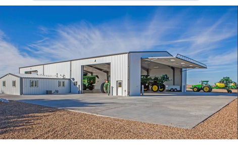 This project features a large agricultural building with tractors outside at sunset, along with farm equipment and machinery.